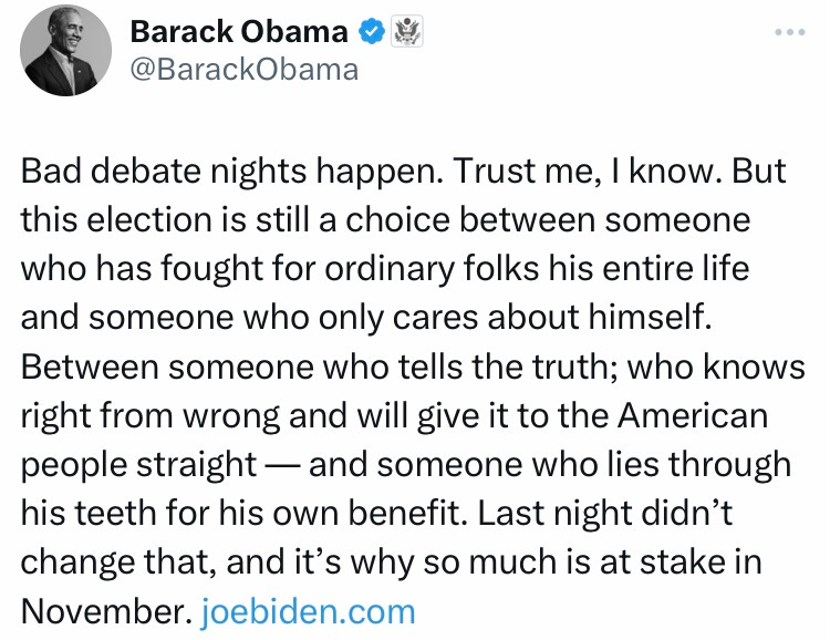 Mais alors que les appels au retrait se sont multipliés dans les médias, difficile d’imaginer que cela soit suffisant pour redresser la barre. Pour autant, Joe Biden semble encore avoir la main sur ses troupes. Le très médiatique gouverneur de Californie Gavin Newsom, a qui l’on prête des ambitions nationales, lui a très vite réaffirmé son soutien tout comme Kamala Harris sa vice-présidente ou encore la sénatrice du Massachusetts proche de la gauche du parti Elizabeth Warren. Mais c’est l’ancien président Barack Obama, le démocrate le plus influent, qui est venu clore le débat (au moins temporairement) en replaçant l’église au centre du village.