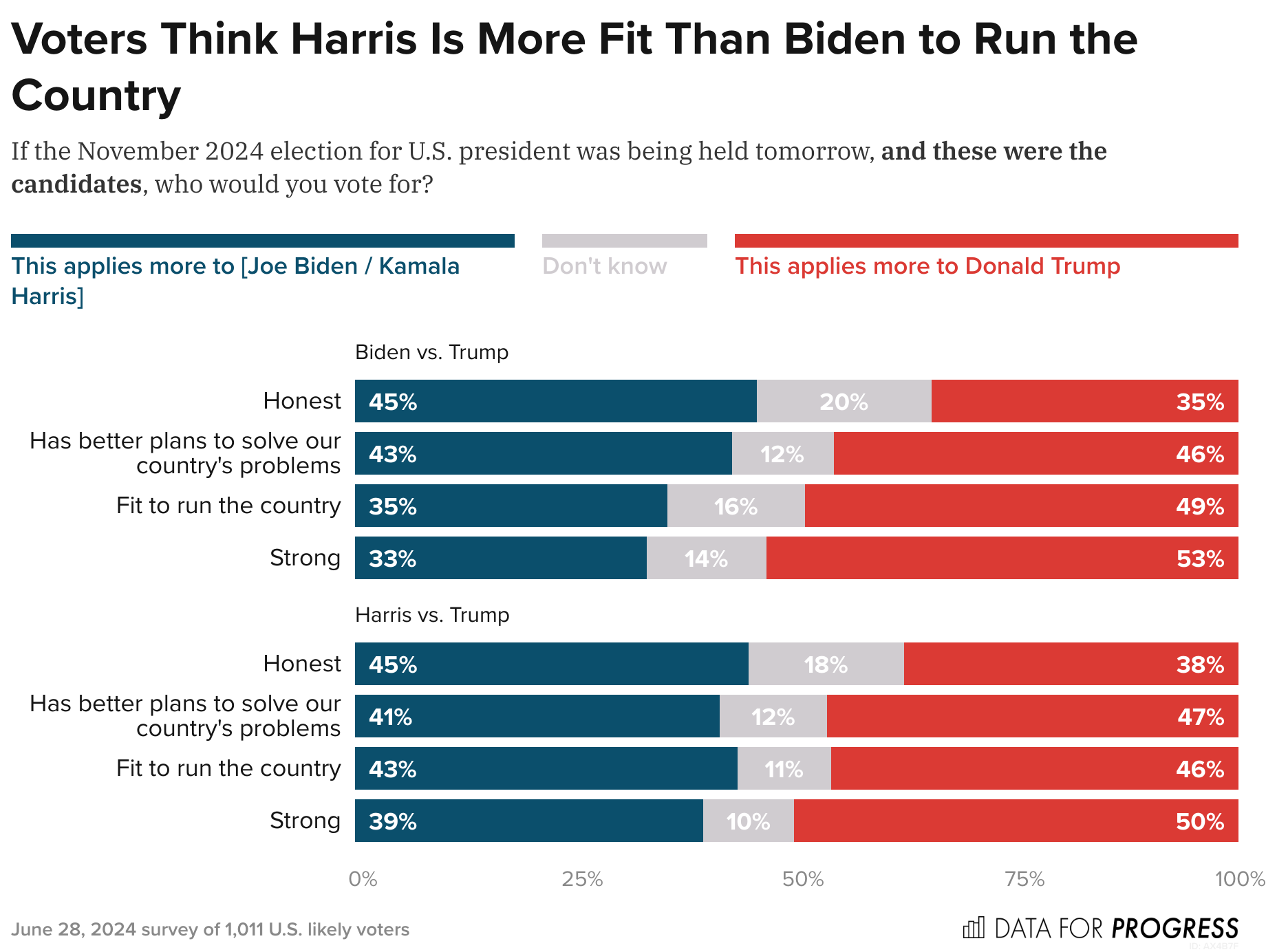 Une montagne se dresse désormais devant le locataire de la Maison Blanche et son parti. Les prochains jours ou prochaines semaines seront déterminants et personne ne peut aujourd’hui assurer connaître la suite de l’histoire. Si Joe Biden reste pour l’heure le candidat démocrate le mieux placé pour affronter Donald Trump et est toujours perçu comme plus honnête selon un nouveau sondage post-débat de l’institut Data for Progress, son âge préoccupe plus l’électorat américain que les ennuis judiciaires de son rival et ce dernier détient aussi un avantage non négligeable au sujet de "l'aptitude à diriger le pays".